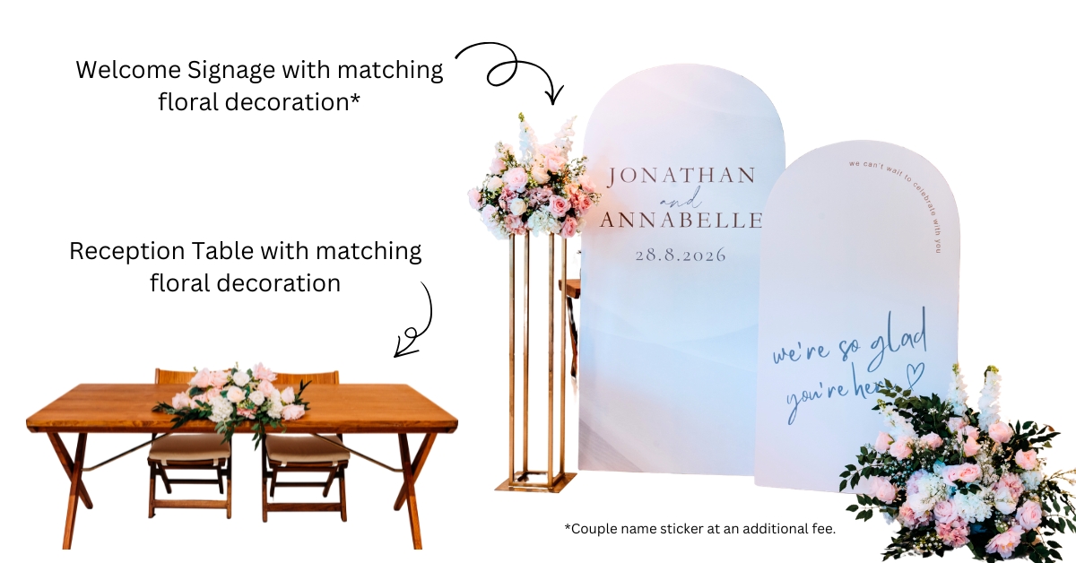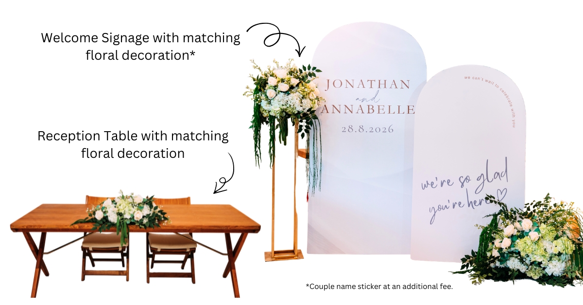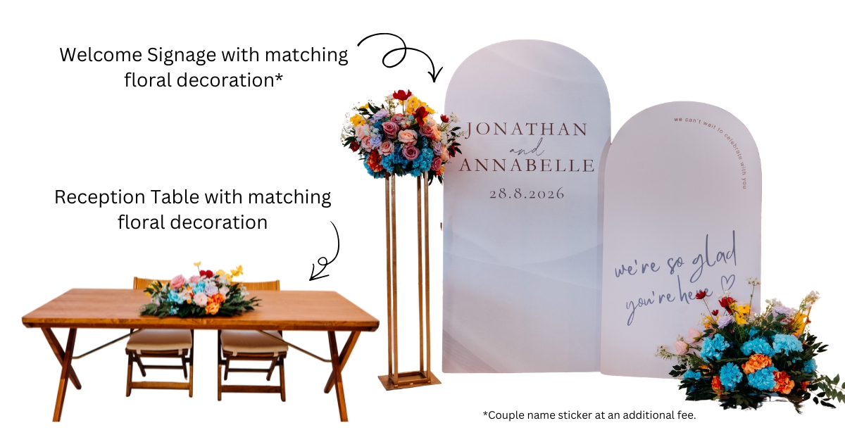 - Additional fees applies for printing of couple names on the welcome signage board.